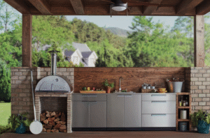 Modern outdoor kitchens are built using materials designed to withstand the elements. Stone, stainless steel, concrete, tile, and weather-resistant cabinetry are standard in high-quality outdoor installations. These materials resist moisture, heat, UV damage, and temperature changes, ensuring your outdoor kitchen holds up year after year.